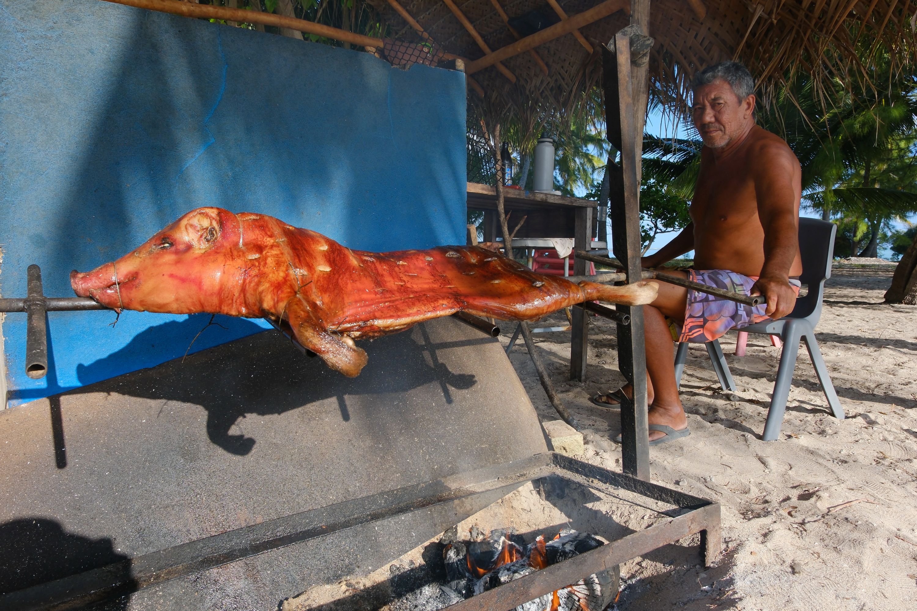 Ab und zu gibt es Schwein am Spieß. Das ließen wir uns nicht entgehen! 😋 Und wir hatten früh genug reserviert.