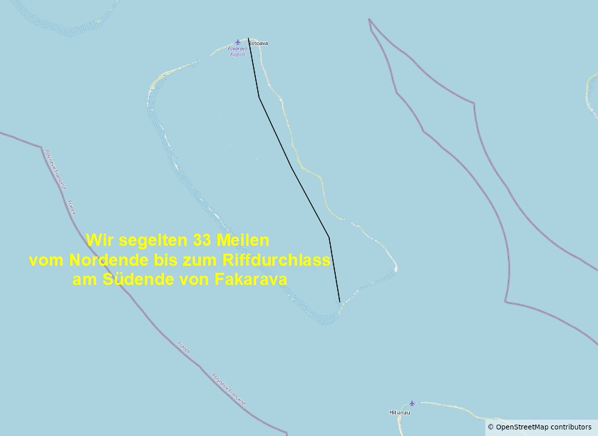 Nach zwei Tagen und mehrmaligem Schnorcheln am Riff, ging es 6 Seemeilen weiter zum Südostende von Fakarava. (Link zu Google Maps)